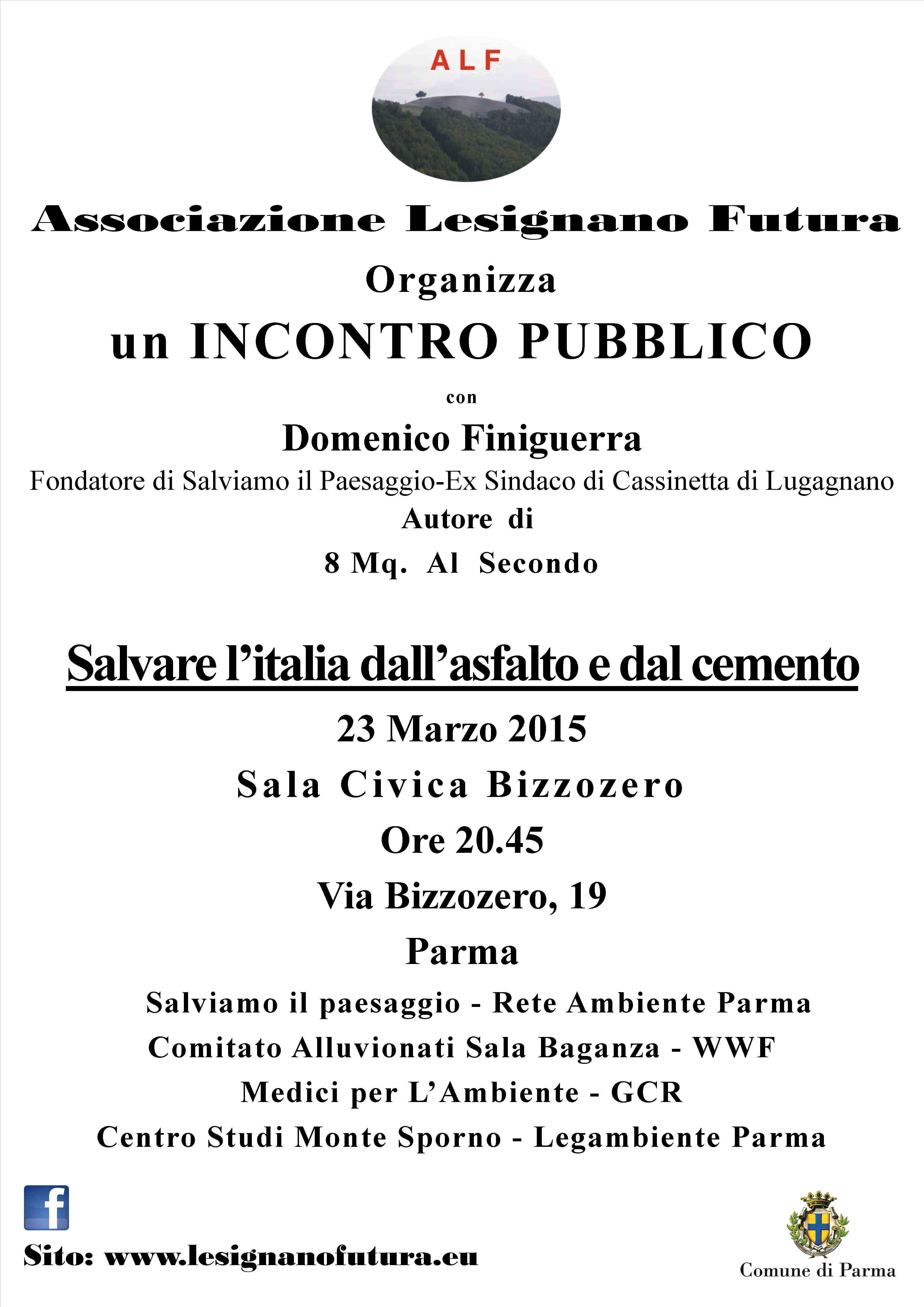 Lunedì 23 marzo ore 20.45 a Parma, sala civica Bizzozero, incontro pubblico “Salvare l’Italia dall’asfalto e dal cemento” organizzato da ALF (Associazione Lesignano Futura) con Domenico Finiguerra autore di “8Mq al secondo”.